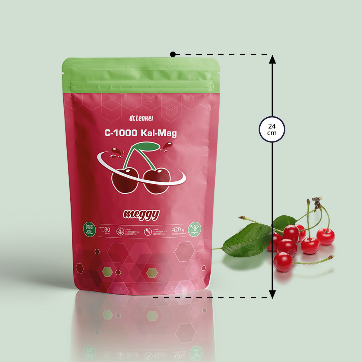 C-vitamin, kalcium- és magnéziumtartalmú italpor édesítőszerekkel, meggyízű étrend-kiegészítő