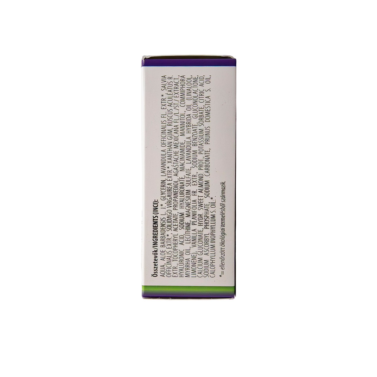aloe levéből kinyert lé -aloe gél*, levendula virág kivonat*, orvosi zsálya kivonat*, közönséges aranyvessző kivonat*, szúrós csodabogyó gyökér kivonat*, mirha olaj, levendulaolaj (linalool, limonene), vanília kivonat, mandulából kinyert hatóanyag, szilvamag olaj, kalabafamag* olaj